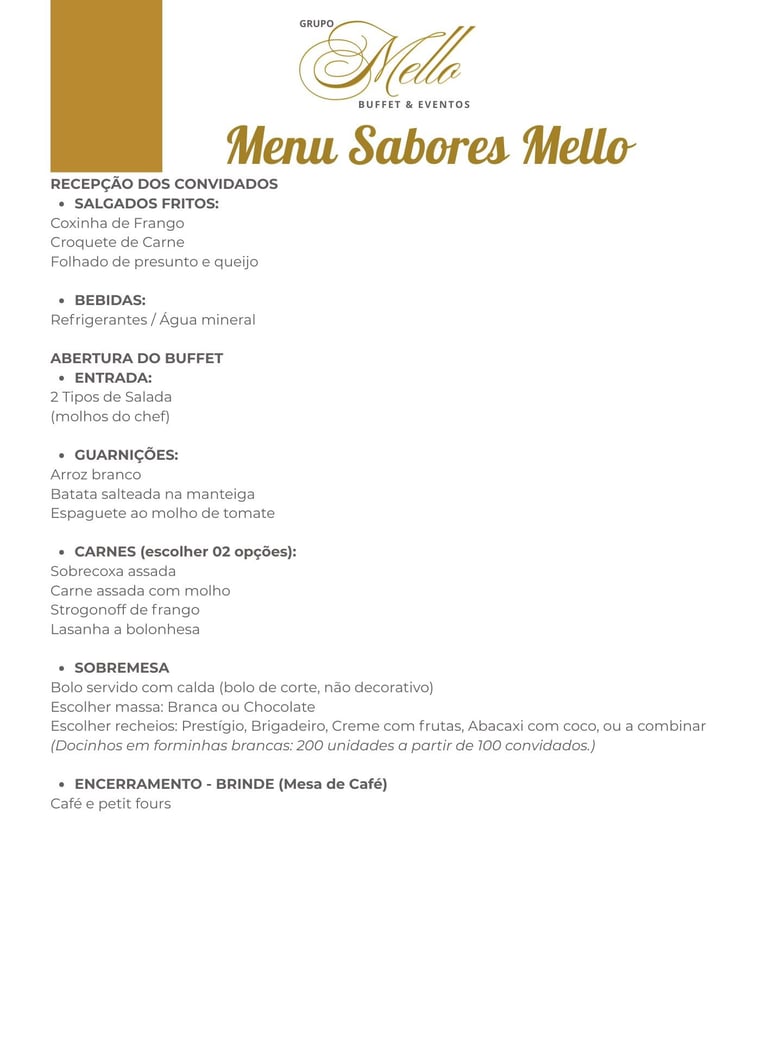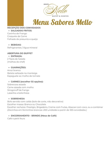 O Menu Sabores Mello foi pensado para receber seus convidados com carinho e sabor, começando com salgados quentinhos e bebidas, seguido de um buffet completo com saladas frescas, guarnições e pratos principais à sua escolha. Para finalizar, um delicioso bolo com recheios variados, docinhos e uma charmosa mesa de café. Ideal para quem busca praticidade, qualidade e um serviço que encanta do início ao fim.