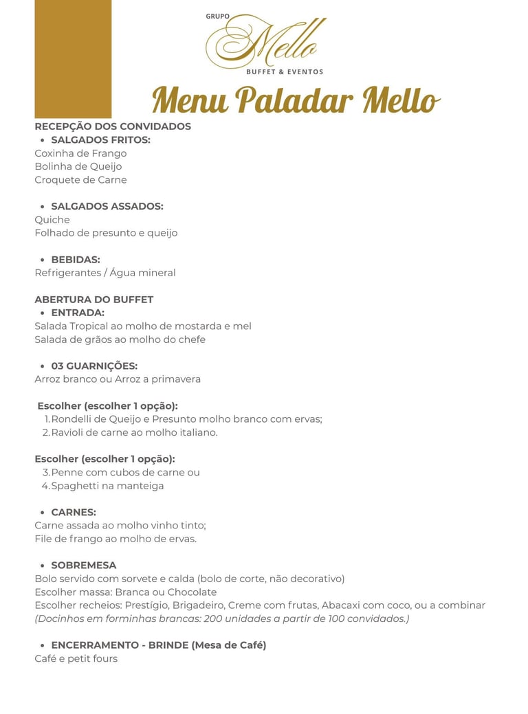 O Menu Paladar Mello oferece uma solução completa para o seu evento, com recepção de salgados e bebidas, buffet com saladas, massas, guarnições e carnes, além de sobremesa com bolo, sorvete e docinhos. Para finalizar, uma mesa de café que completa a experiência. Ideal para quem busca praticidade, qualidade e um excelente custo-benefício.