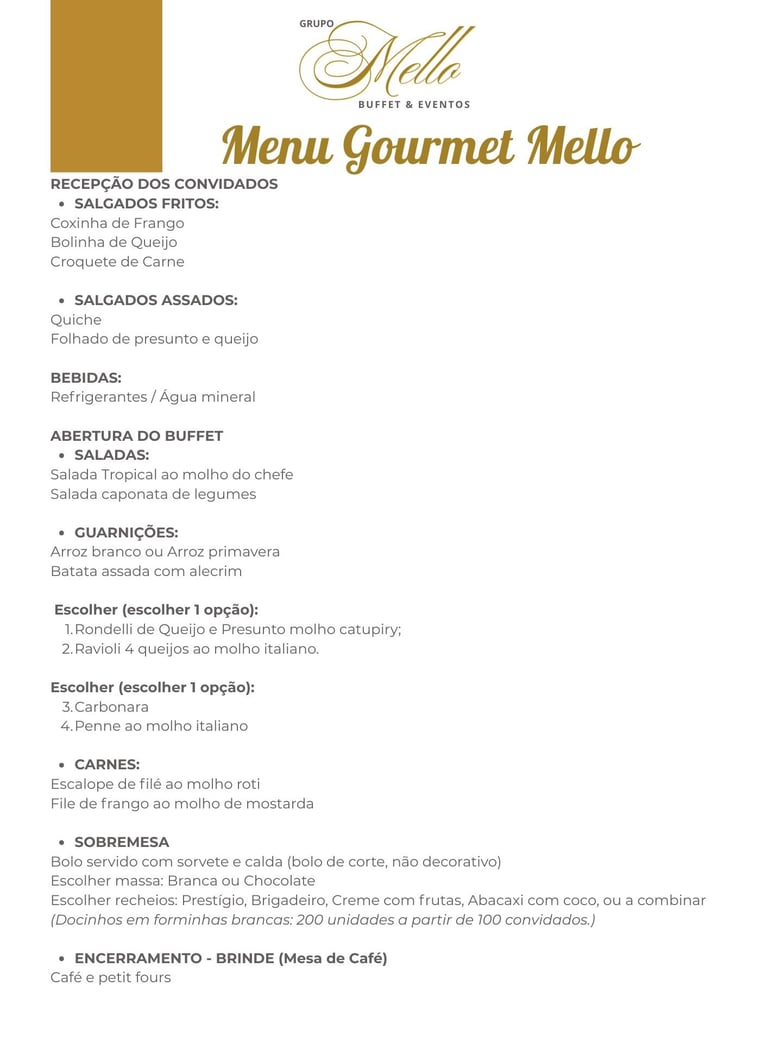 O Menu Gourmet Mello foi pensado para quem deseja oferecer uma experiência mais completa e refinada aos convidados. A recepção conta com salgados e bebidas, seguida por um buffet completo com saladas elaboradas, massas selecionadas, guarnições e carnes nobres. A finalização inclui bolo com sorvete, docinhos e uma charmosa mesa de café. Ideal para eventos que pedem um serviço diferenciado, com qualidade e excelente apresentação.